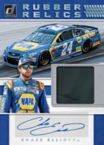 Rubber Relic Signatures features the top drivers along with a tire swatch and an autograph. Search for parallels numbered 25 or less and 1 of 1.