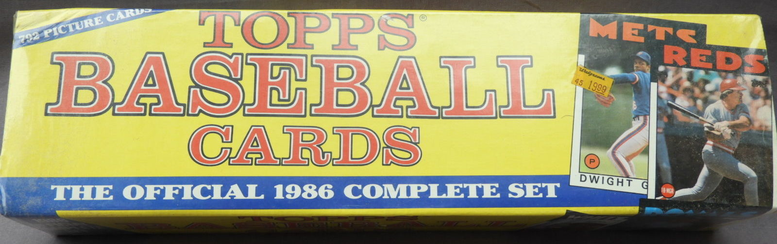 1986 Topps Baseball is a 792 card set that first appeared in 35-cent wax packs, rak-packs, and in factory set form. These cards are not rare and you can still find un-opened packs/boxes for sale on eBay today. The more notable (and valuable) rookie cards appear in the 1986 Topps Traded set that followed the release of the main set listed below. There’s still some collector value in the individual cards, but keep in mind actually selling for the values listed is somewhat difficult because the cards are so common – and most die-hard card collectors have already collected this set. More common is finding completed sales of complete sets, which will sell for a fraction of the total values listed below. We’ve listed complete 1986 Topps Baseball card set values at the bottom of the article.
