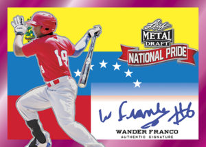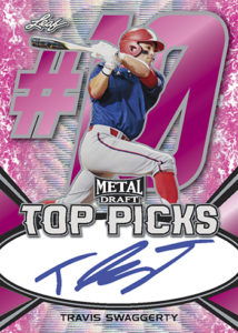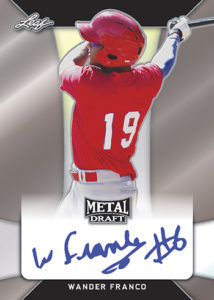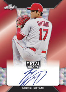 Metal Draft showcases plenty of parallels including the new colored waved prismatic parallels. This features players like Shohei Ohtani, Ronald Acuña Jr., Vladimir Guerrero Jr., Casey Mize, Jarred Kelenic, Ryan Weathers, Wander Franco, Luis Robert, Travis Swaggerty, Joey Bart, Estevan Florial, Alec Mohm, and Jonathan India.