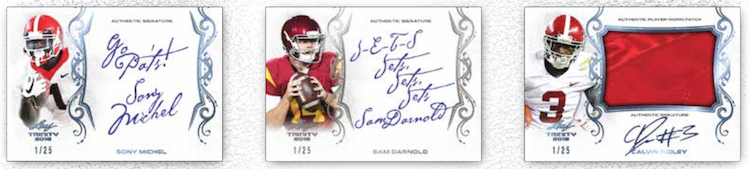This all-hit three-tiered product of Leaf will soon arrive with a mix of approaches and big names from the college game and the NFL Draft. 2018 Leaf Trinity Football comes with five on-card autographs per box.