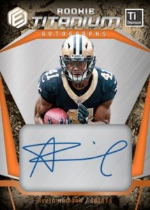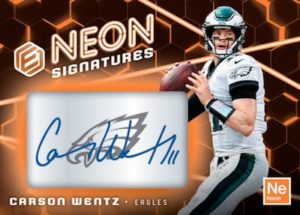 There will also be Rookie Titanium Autographs with trapped metal autos with copper (#’d/299), Silver (#’d/99) and 1/1 Gold versions for top rookies from this year’s class. Also in play are Neon Signatures which features both past and present players. This will have Orange (#’d/125), Blue (#’d/50) and 1/1 Yellow versions as well as tiers.