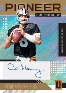 The Rookie Jersey autos features 2018 draftees and limited parallels and will have Impact, Hyper, Fireworks and Burst versions, while the cornerstone of Pioneer Penmanship will be on past greats with the same parallels but lower volume, this will have Impact (#’d/50), Hyper (#’d/25), Fireworks (#’d/5) and 1/1 Burst. Star Signatures will have the same parallels. Also in play will be Undeniable.