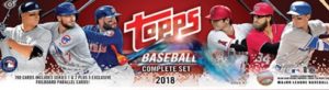 The 2018 Topps Baseball Complete Sets contain base cards #1-700 from Series 1 and 2. It also contains a five-card pack of exclusive sequentially-numbered foil board parallel cards.