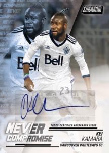 Autographs parallels include Black & White Parallel, Members Only Parallel (Sequentially #’d to 50), and Sepia Parallel (#’d 1/1). Co-Signers Autographs features autographs of thematically-paired MLS veterans (sequentially numbered), while the Never Compromise Autographs features the league’s standout players (sequentially numbered)