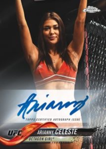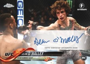 Athlete Autographs feature up to 35 of the UFC’s elite athletes and includes OctoFractor – Third autograph card per box (Hot box only), Green Refractor (#’d/99), Blue Wave Refractor (#’d/75), Gold Refractor (#’d/50), Orange Refractor (#’d/25), Black Refractor (#’d/10), Red Refractor (#’d/5), and SuperFractor (#’d 1/1).