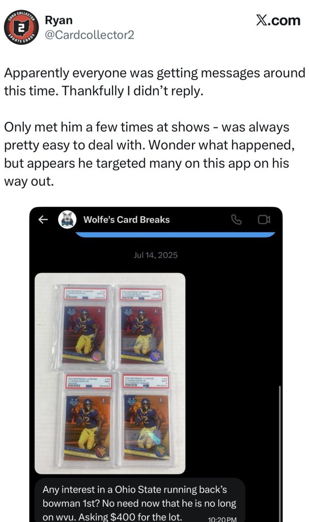Ryan (@Cardcollector2) shared a screenshot from July 2025—months before things got bad. Wolfe was mass-messaging collectors offering deals. Four graded Ohio State Bowman 1sts for $400.