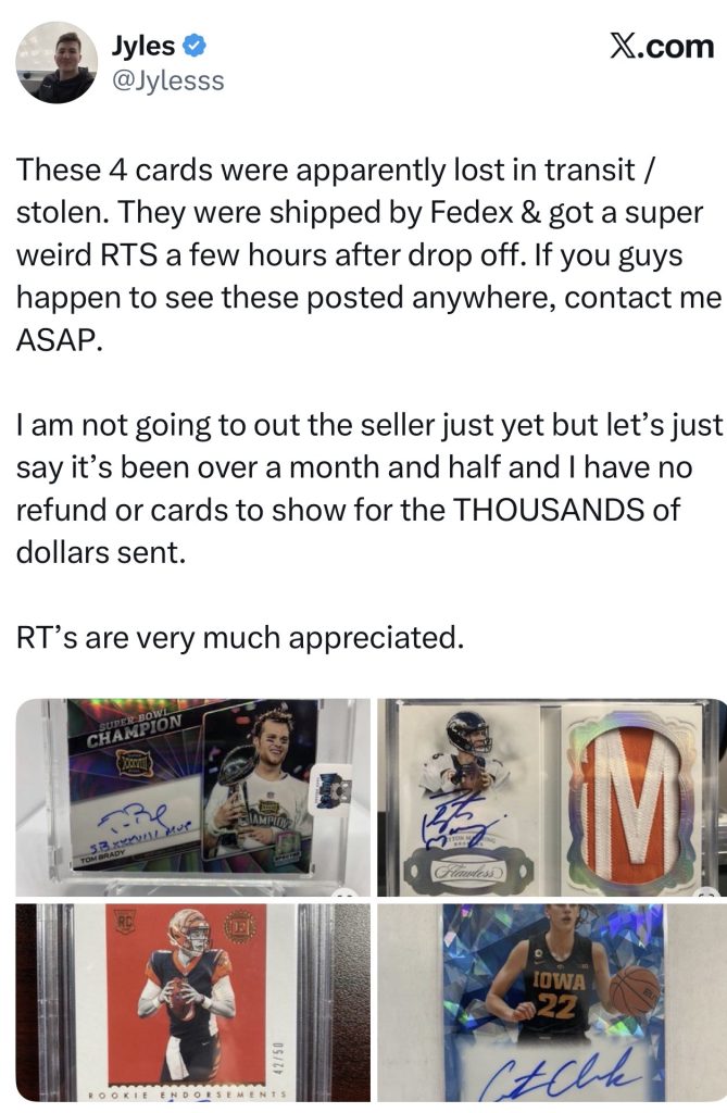 Jyles posted about four high-value cards that were supposedly “lost in transit.” Shipped via FedEx, got a weird return-to-sender hours after drop-off. Over a month later: no refund, no cards, thousands gone.