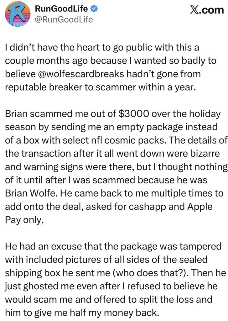 RunGoodLife got scammed for three grand during the holidays. Wolfe sent an empty package instead of select NFL cosmic packs.