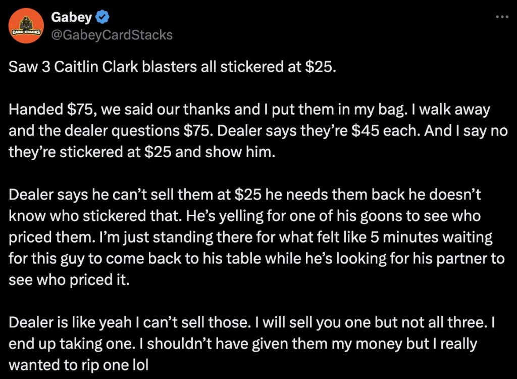 At a recent trading card show, a collector, known on social media as @GabeyCardStacks, encountered a frustrating situation involving mispriced merchandise.