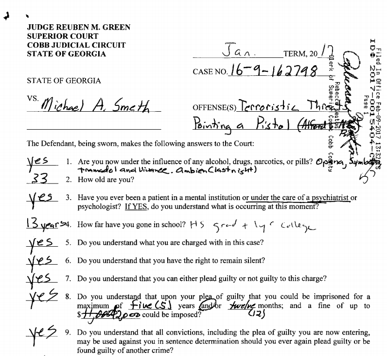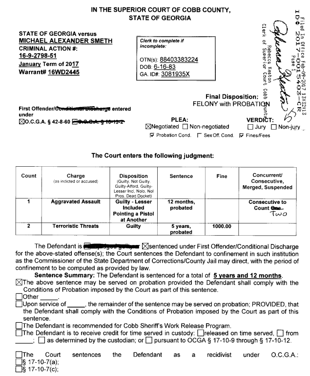 The erratic Smeth was sentenced to 5 years and 12 months probation after pleading guilty on February 9, 2017.