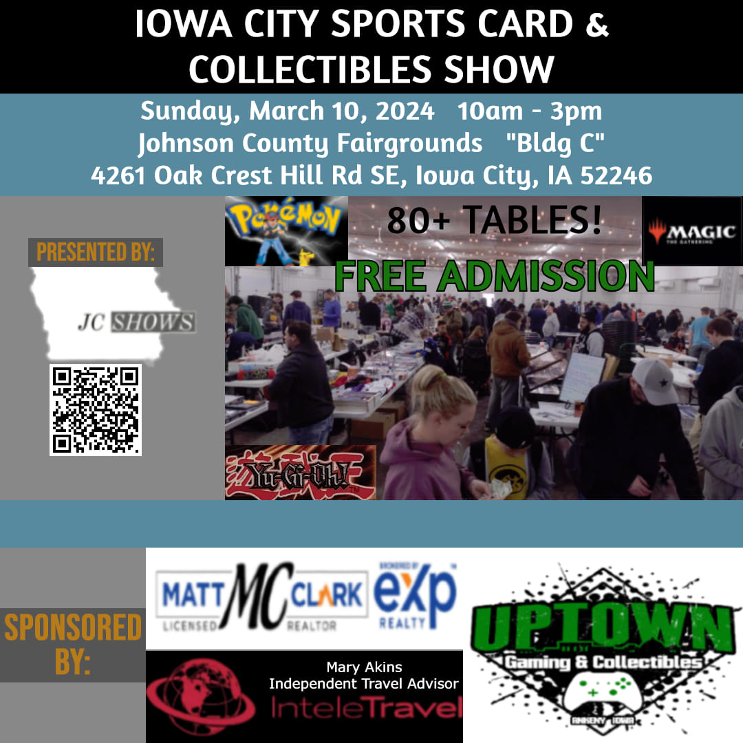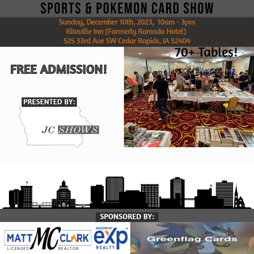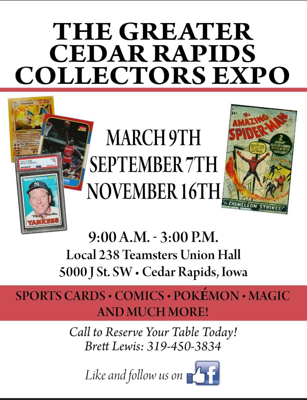 Mark your calendars for the largest card show in the Cedar Rapids area in many years! Multiple Dealers coming from Minnesota, and Illinois, and from all around Iowa, expect a wide variety of Pre-War Vintage to Modern Sports Cards. Let's not forget about TCG ~Pokemon, Magic The Gathering, Yu-Gi-Oh, & Weiss Schwarz Cards, Comics, and […]