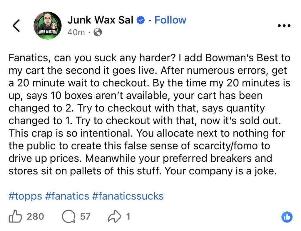 Junk Wax Sal’s frustration is justified. And it’s not unique to him—it’s what thousands of collectors experience every time Fanatics drops a new product.