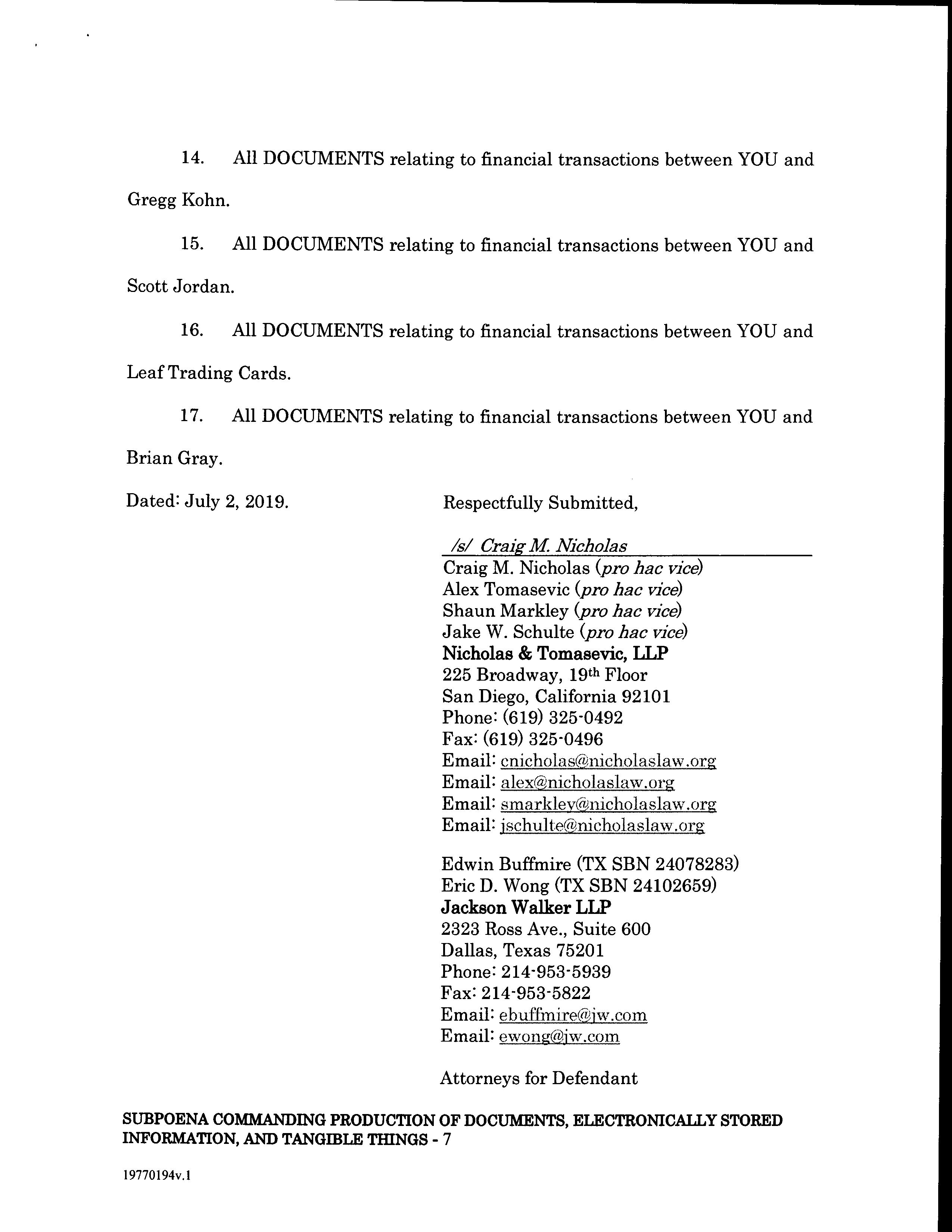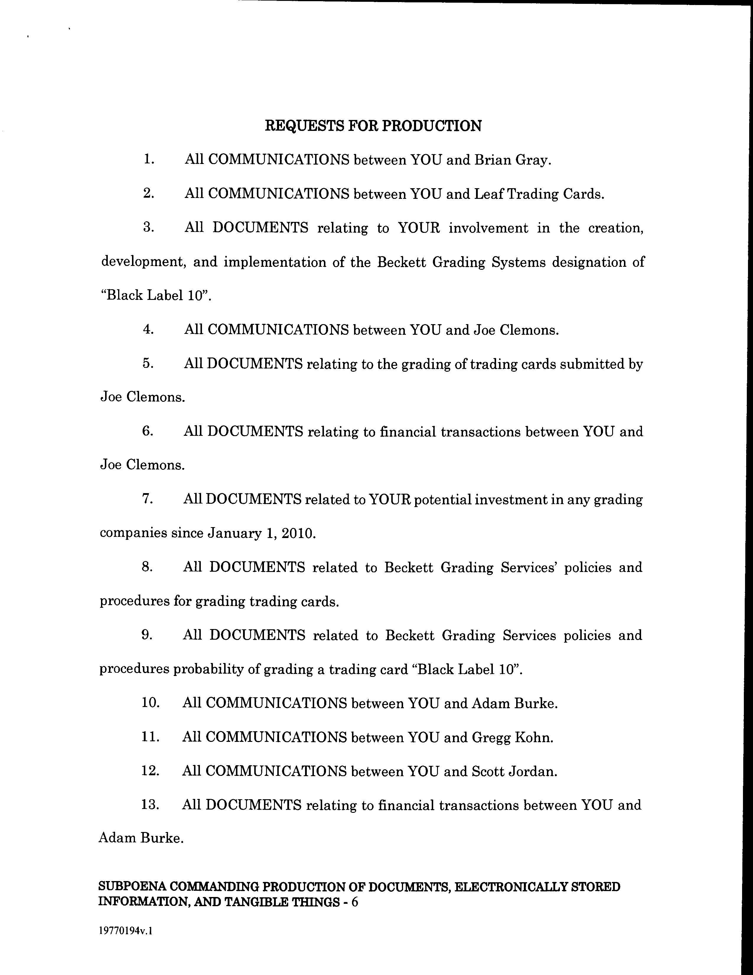 The requests come from attorney's representing Upper Deck in a civil lawsuit against Leaf Trading Cards.