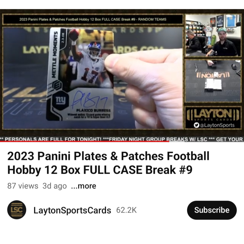 While waiting for the promised card, this collector, who already has an active open redemption ticket with Panini, was surprised to see two of the exact Plaxico Burress cards being pulled from 2023 Plates and Patches Football boxes during a live break – a year after the redemption card was first acquired.