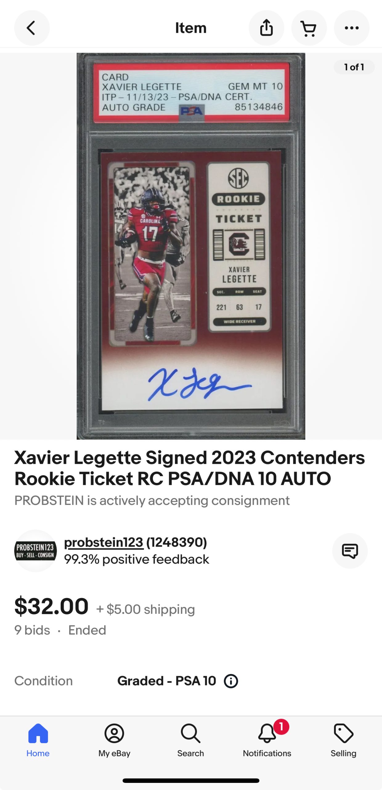 But wait, it gets juicier. This Xavier Legette card, sold on February 12th through Probstein’s Prostein123 auctions on eBay, seems to have a twin. Or maybe a triplet? This same card, with the exact same certification number, reportedly sold not once, but twice on the ultimatesportsmarketing eBay account back in December.