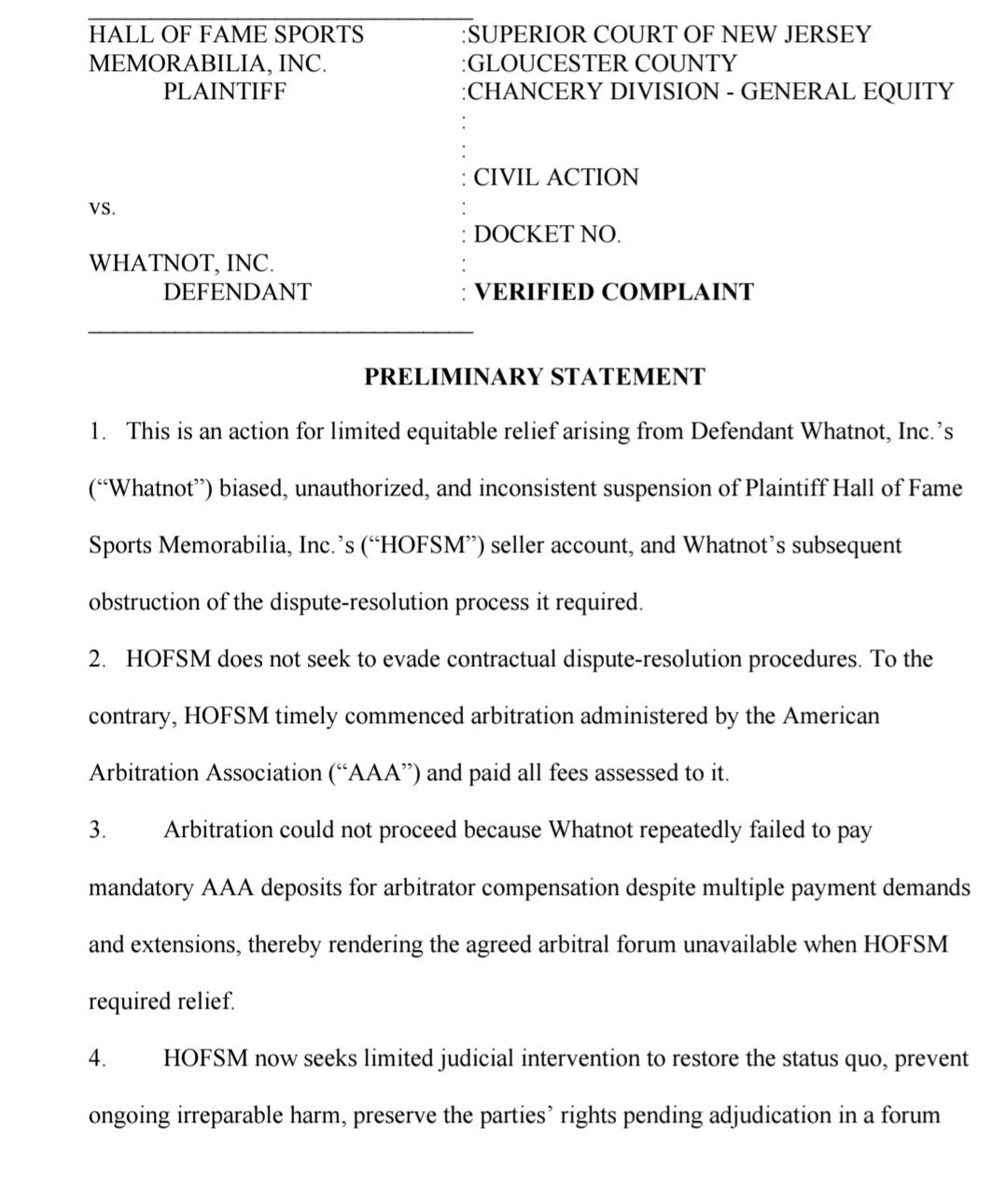 Hall of Fame Sports Memorabilia, Inc. (HOFSM) has filed a verified complaint against Whatnot in the Superior Court of New Jersey. The accusation? A biased, inconsistent account suspension — and a dispute process that went nowhere.