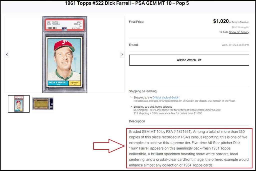 The hobby’s trust in the "PSA 10" label took a hit after a trimmed PSA 10 1961 Topps Dick Farrell #522 was linked to Collectors CEO Nat Turner.
