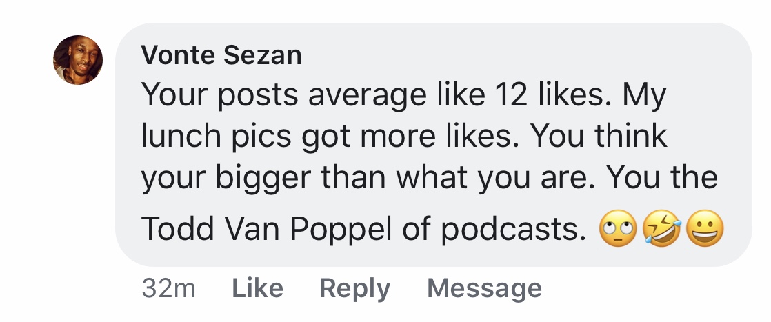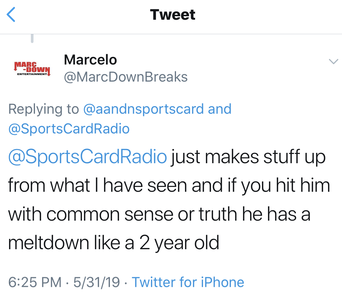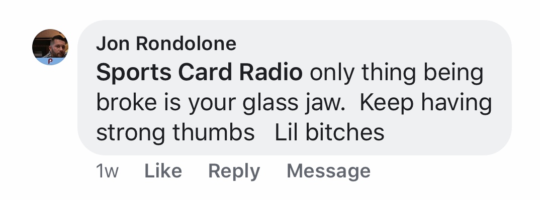 Another hater popped up on Facebook & hung around for a little while even after being put on the homepage of Sports Card Radio.