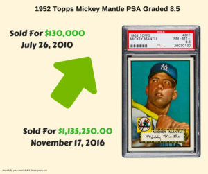 During 2016, numerous Mickey Mantle cards sold, but the highlights include a PSA 8.5 version of his 1952 card which sold for over $1.1M in November. The same card sold for a ”mere” $130,000 back in 2010, when economic times were much bleaker.