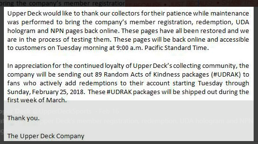 Not to be outdone, the entire redemption portion of Upper Deck's website was down for over four weeks, starting around January 21, 2018. News of the outage was first reported on the Hobby Insider Forum (must be member to view).